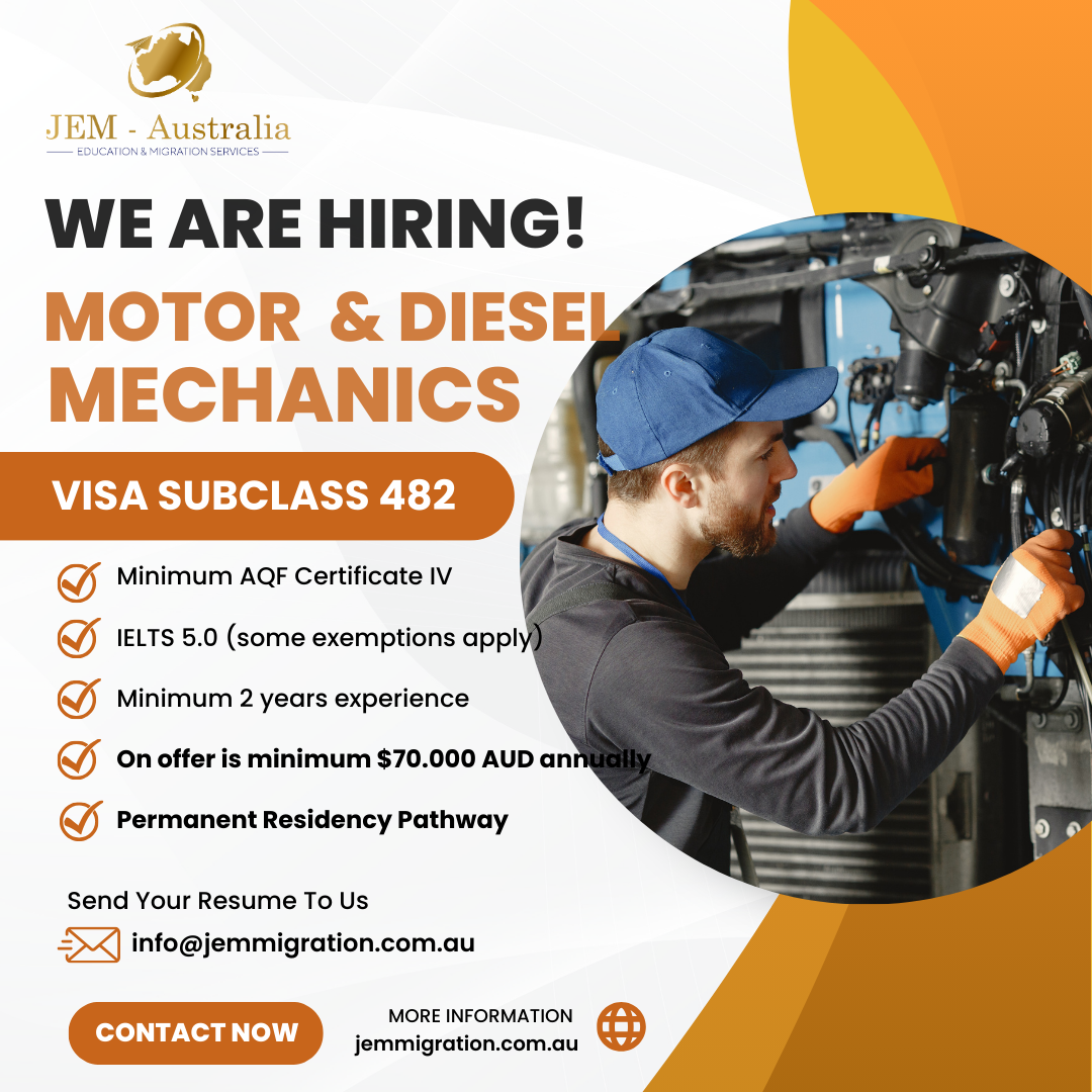JOB OPPORTUNITIES! Are you a skilled Mechanics seeking your next career adventure? Our sponsors offer Visa 482!